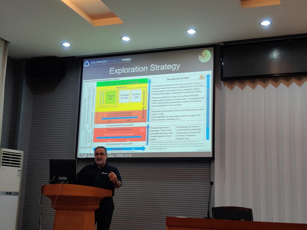 第一个报告简要说明了太空采矿策略,并分别从月球、火星和行星采矿方面展开太空采矿的首要目标是获取水资源,现已探明在月球和火星两极凹坑内均有冰存在,Rostami教授展示了针对这种特殊的工况设计一些特殊的钻进和挖掘设备,及其所在实验室研发的一款对冻土地层的可扩展挖掘宽度的采矿机头;在对小行星上的采矿研究上,无需对地外星体的探索,在大量的小行星向地球靠近过程中捕捉小行星技术便成为项目重点,报告对相关情况进行了介绍。第二个报告则展示了科研人员经常遇到的论文类型,然后针对同行评议的期刊出版物,给出了论文撰写中应该注意和避免的事项。