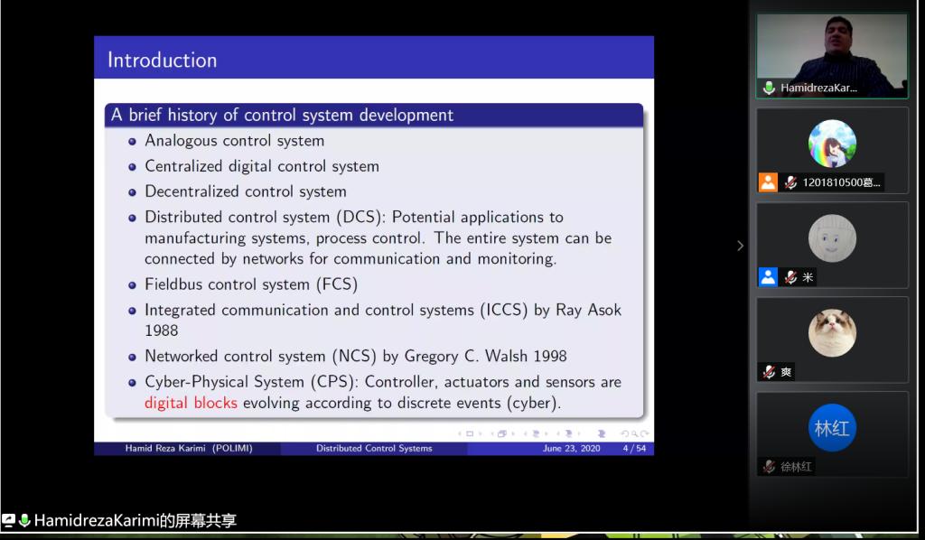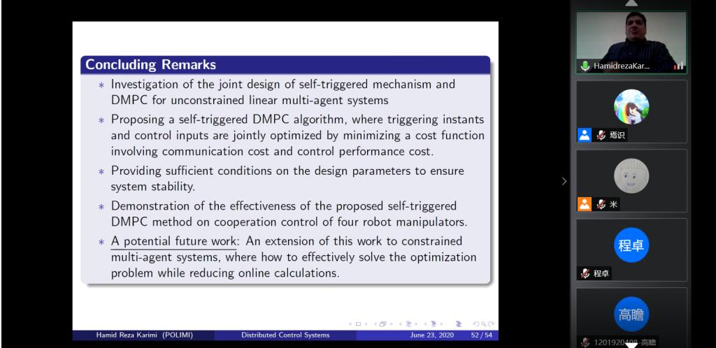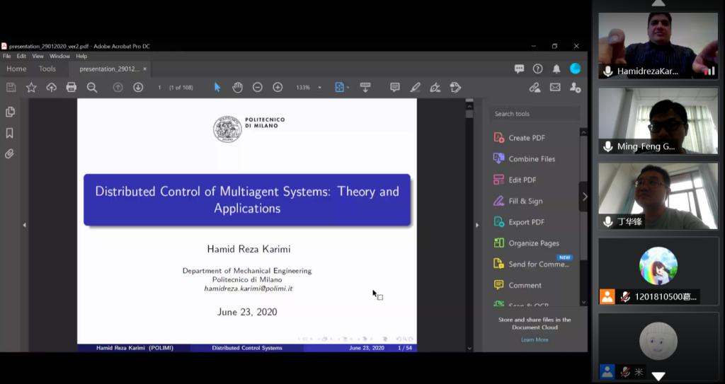 应机械与电子信息学院院长丁华锋教授邀请,意大利米兰理工大学Hamid Reza Karim教授于6月23日通过线上会议来我校作题为Distribute Control of Mult iagent System:Theory and Applications的学术报告。报告会由葛明峰老师主持,我院罗杰副院长、李敏、雷波、王玉丹等老师以及研究生均出席了报告会。