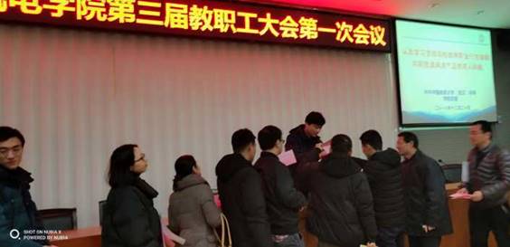 (机电学院工会高翟)2018年12月20日下午,机械与电子信息学院(以下简称机电学院)第三届教职工大会第一次会议暨第三届工会会员大会第一次会议在教二楼301会堂隆重召开。校工会于荣萍副主席及机电学院全体教职工与会,会议由机电学院党委副书记于晓舟同志主持。