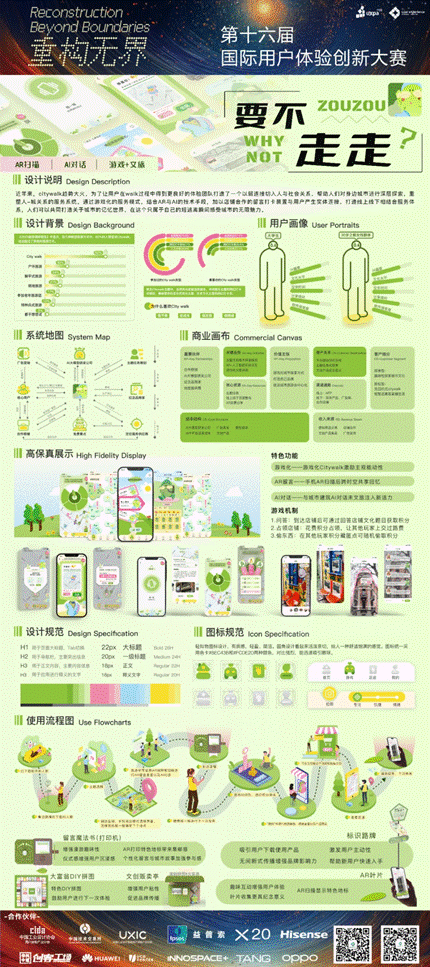 创作理念:近年来,citywalk趋势大火,为了让用户在walk过程中得到更良好的体验,联系重构无界关键词,团队打造了一个以弱连接切入人与社会关系,帮助人们对身边城市进行深层探索,重塑人-城关系的服务系统。通过游戏化的服务模式,结合AR与AI的技术手段,加以店铺合作的留言打卡装置与用户产生实体连接,打造线上线下相结合服务体系,人们可以共同打造关于城市的记忆世界,在这个只属于自己的短逃离瞬间感受城市的无限魅力