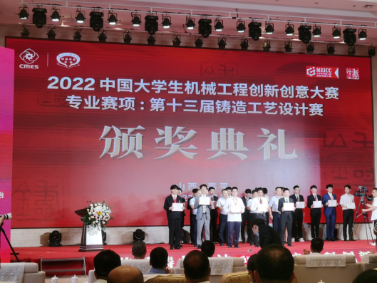 2022年7月4日,2022中国大学生机械工程创新创意大赛专业赛项:第十三届铸造工艺设计赛在山西省高平市落下帷幕。本届大赛自2021年8月启动以来,共有101所院校(其中我校是第二次参赛)的835份作品参赛,入围评比作品480份(本科生组434份、研究生组46份),参赛作品分别由 1530名本科生及 120名硕士生完成。经过评审专家独立盲审、组内讨论复审、现场答辩评审和铸造知识竞赛等环节后,我校机械与电子信息学院遴选的参赛作品取得优异成绩,获得全国二等奖1项、三等奖4项,获奖学生人数为19人。