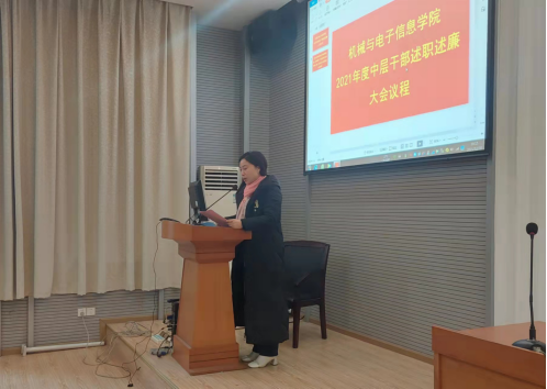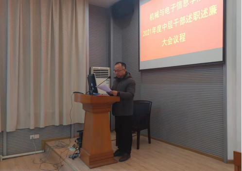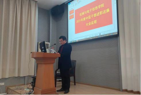 2021年12月30日,机械与电子信息学院2021年度中层干部述职述廉报告大会兼第三届教职工大会第四次会议暨工会会员大会在教二楼301顺利召开。会议由机电学院党委书记瞿祥华主持,机电学院院长丁华锋、副书记于晓舟、副院长李波、罗杰、文国军、黄田野院领导班子成员、中层干部、职工代表等100余人参加了会议。