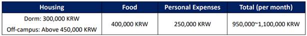 费用:免学费,住宿费学院按照6000元人民币/人(安山校区)、12000元人民币/人(首尔校区)标准予以资助,隔离费用全额资助,其他费用自理。