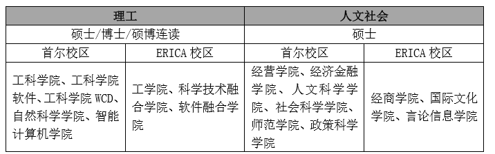 该校分为有首尔和ERICA两大校区。学校硕士学位课程,6个系列 1个学部 89门学科,26个学科间协同课程,35个学研产协同课程。博士学位课程,6个系列 1个学部 85门学科,19个学科间协同课程,37个学研产协同课程。