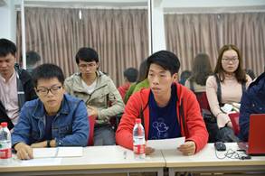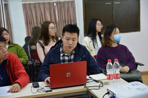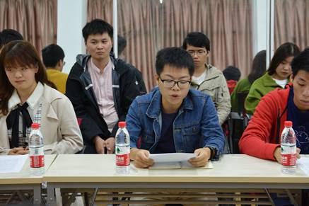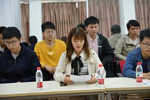 研会老成员代表、办公室负责同学刘彬发言。他结合自己上一学年的经历,从学习、科研、生活、工作等方面给新同学们提出了建议,并希望研会成员能共同努力、服务同学,将研会建设的越来越好。