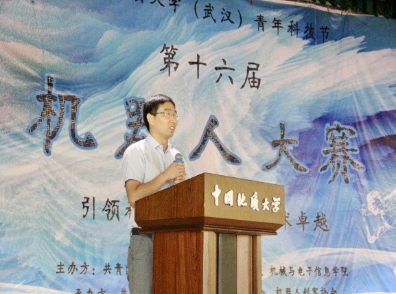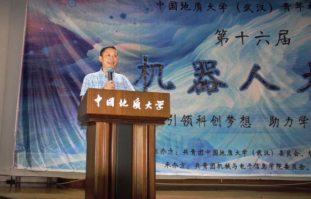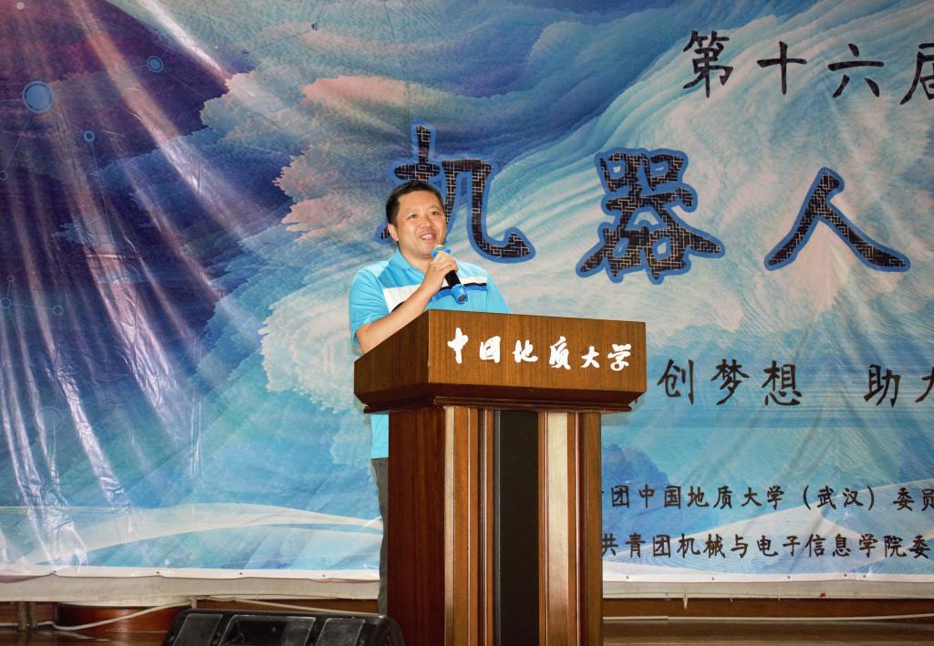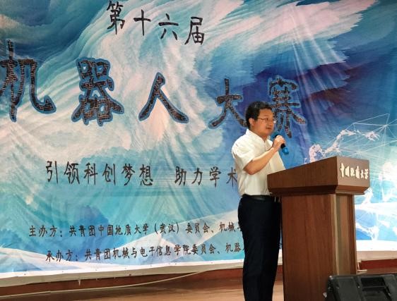 (通讯员:杨晴 摄影:机电团委新媒体中心)“引领科创梦想 助力学术卓越”,中国地质大学(武汉)第十六届机器人大赛于6月2日14:30在大学生活动中心二楼演播厅正式拉开序幕。学生就业创业指导处处长严嘉、教务处副处长张建和、校团委副书记谭文伦,机械与电子信息学院院长丁华锋、党委副书记于晓舟、团委书记杜育,五位专业评委老师殷蔚明、程卓、蔡建平、韩光超、郝国成,以及66支参赛队伍出席开幕式。