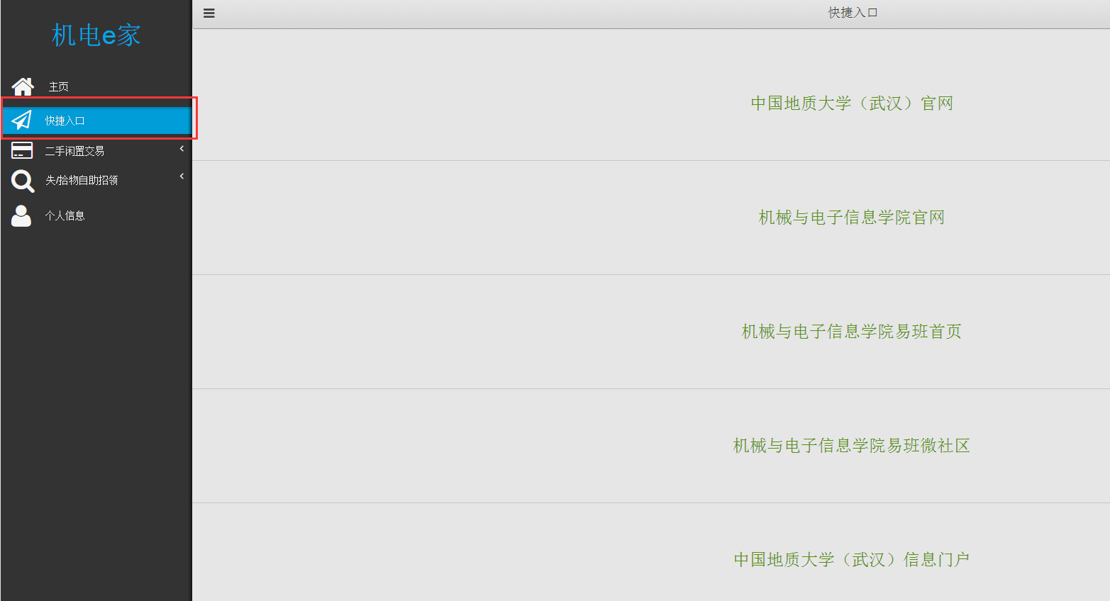 快捷入口,可直接通过此处快捷进入中国地质大学(武汉)官网、中国地质大学(武汉)信息门户等网站