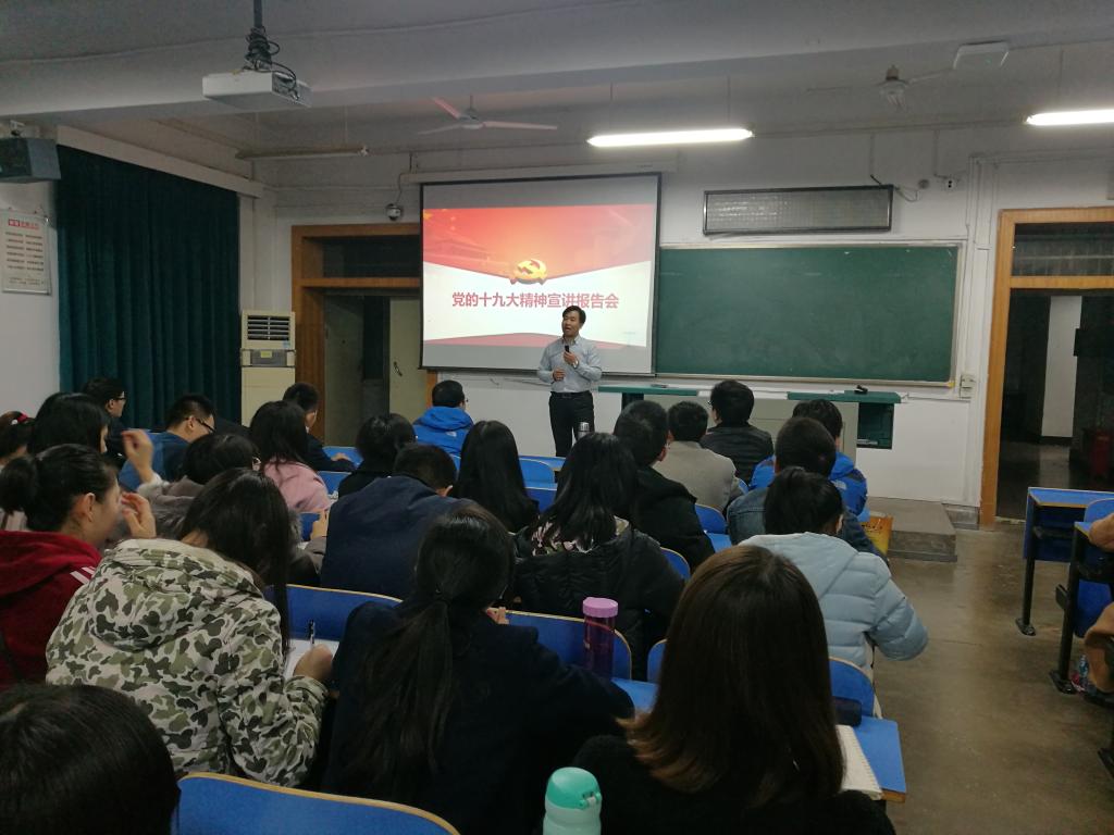 (通讯员 胡畔)11月28日晚,我院全体学生党员在教一楼205开展党的十九大精神学习活动。本次学习活动邀请到武汉市招商局副局长胡何宇同志担任主讲嘉宾。